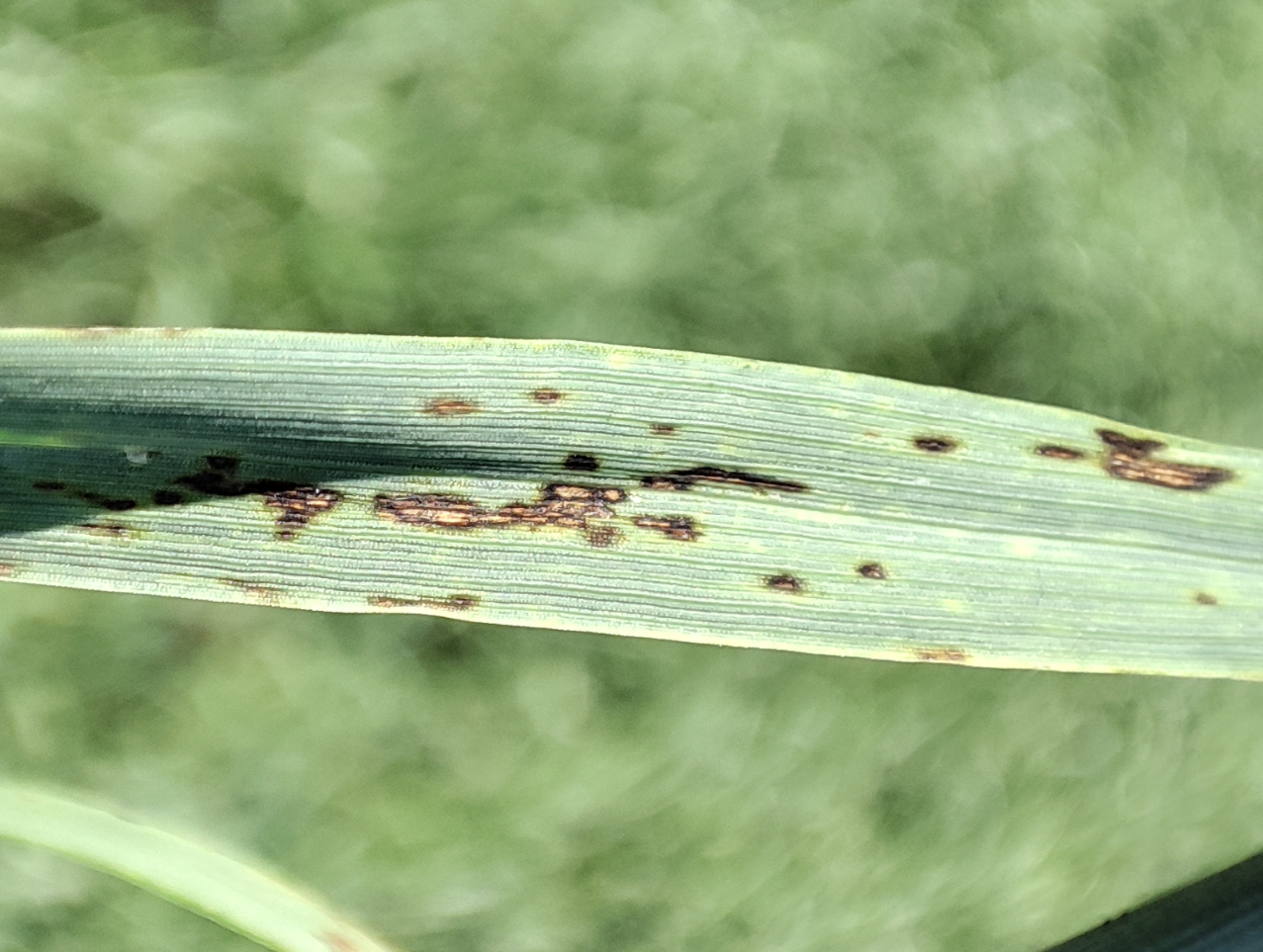 Болезнь поражает листья (патоген может поражать корни, листья, колос растения). Симптомы характеризуются образованием темно-коричневых пятен – от точеных до веретенообразных, вплоть до овальных, что усложняет диагностику. Спороносцы Drechlera sorokiniana стоят по отдельности,